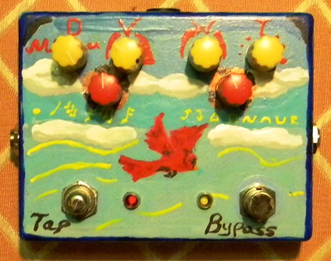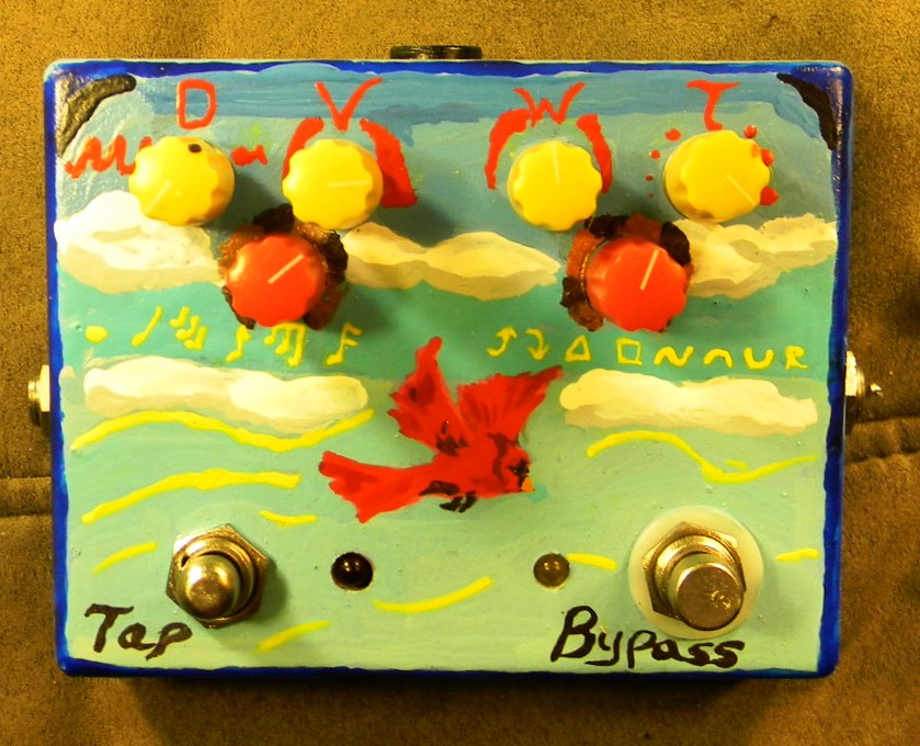 A bit of irony regarding fixing this is that for the new project I designed this week I’m planning now uses the same digital chip as the Cardinal tremolo for tap tempo and everything — but I’m pairing the chip with a circuit that does both normal tremolo and the extremely-rare-but-awesome harmonic tremolo found on Fender amps from the early 1960s. Since this would retire this Cardinal, and because I arrived at the final version of the design on the anniversary of building it, I’ve decided to name the forthcoming circuit the Cardinal Tremolo. Plus it gives me an excuse to paint more birdies!