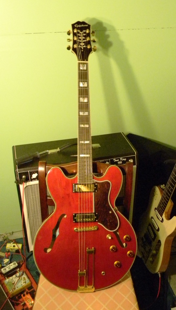 In the late 90s, when I was in high school, I had an Epiphone Sheraton II. Who knows how I paid for it at the time, because it would have been more than $500. It’s like a Gibson ES-335, a really common blues guitar. I’ve been missing it for quite some time ever since I sold it while we were saving up for the house. Then I ran across this one on Craigslist, played it, and picked it up used from a guy up near Bel Air. It’s a reproduction of a 1962 Epiphone model, and it has a different tailpiece and different pickups. It’s a much better guitar than the one I sold, but that’s not really what this post is about.
